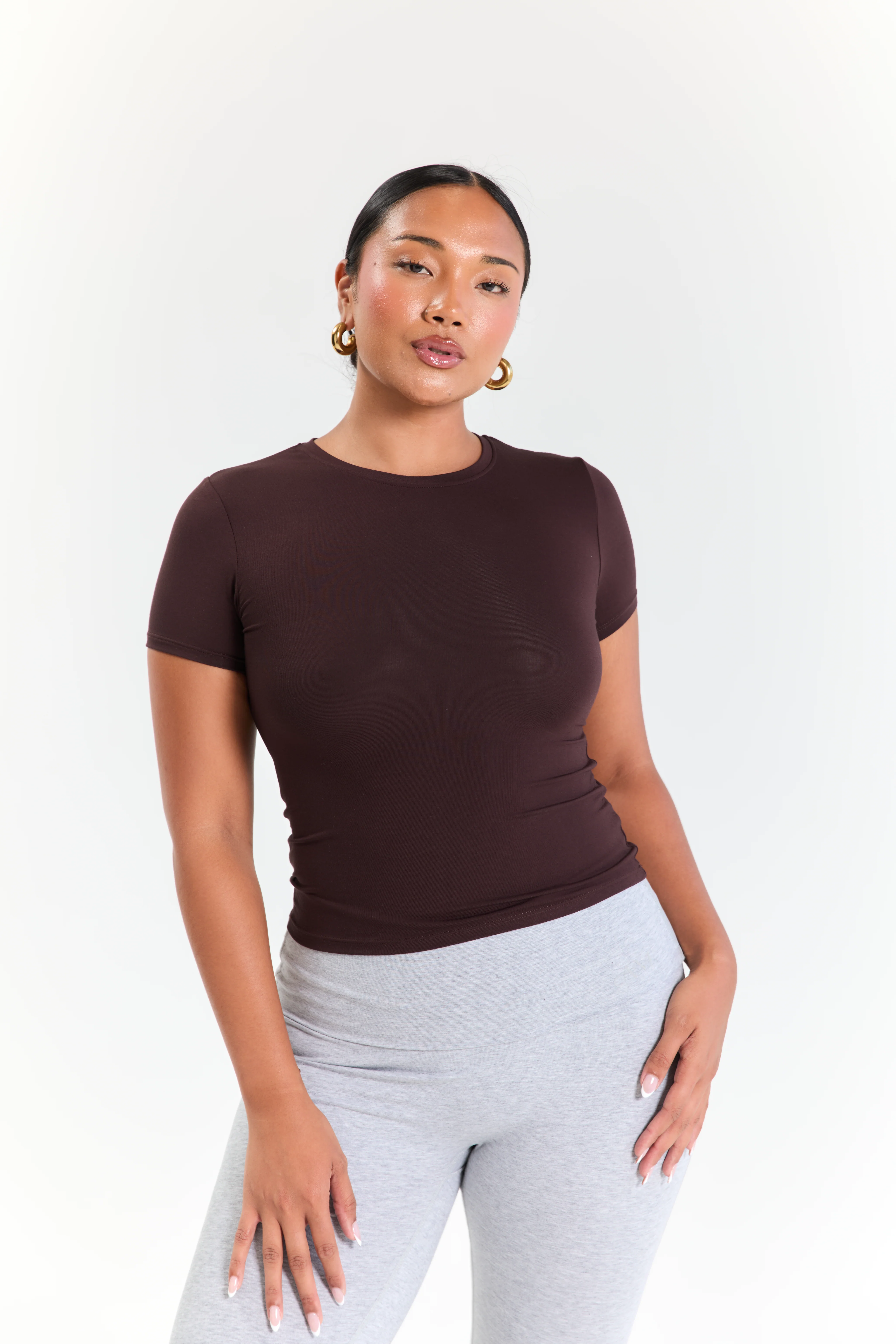 Our classic Baby Tee in Chocolate is a wardrobe staple. This tee is made from a super-soft, stretchy modal cotton fabrication that flatters in all the right places. Our Baby Tee features a round neck and short sleeves with a subtle AFM logo detail on the back.