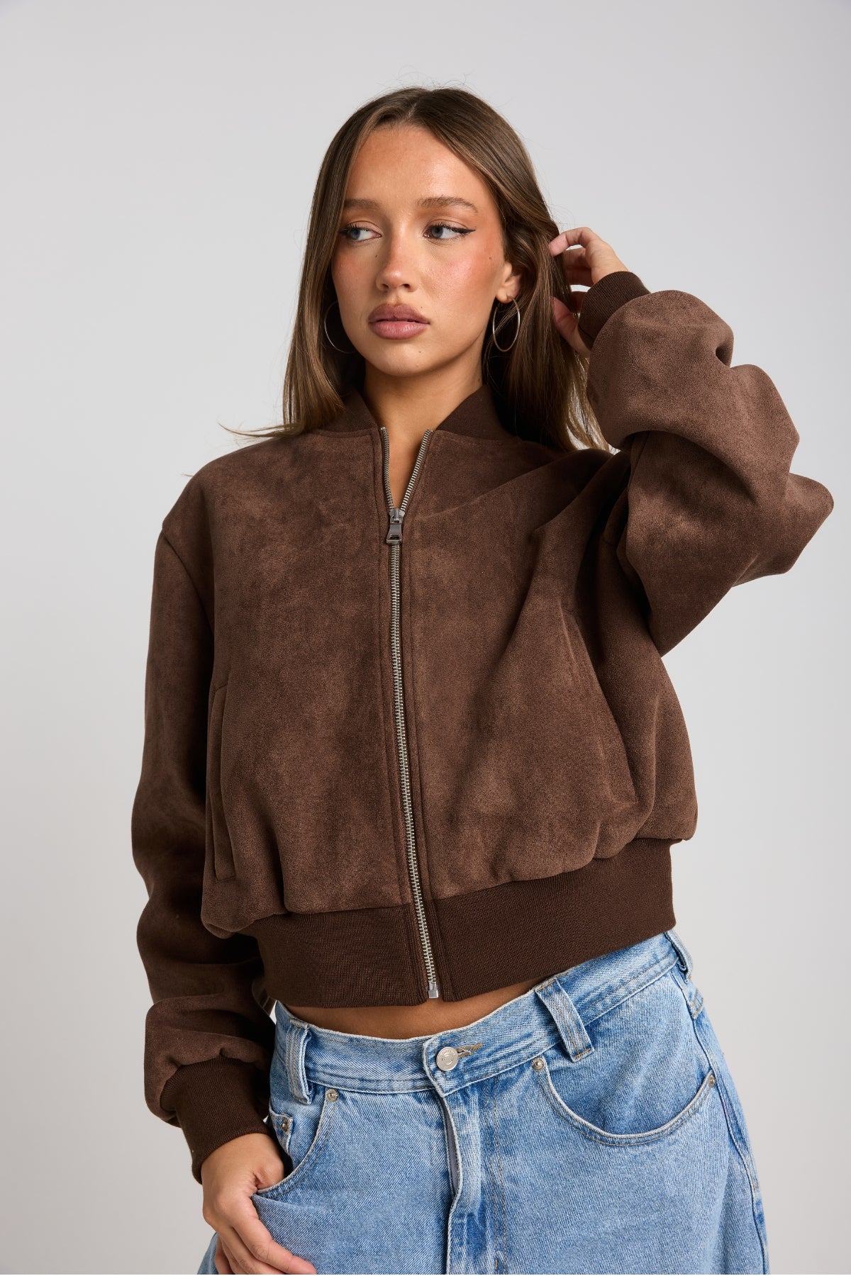 One of our most loved pieces - our faux-suede bomber in Cocoa.