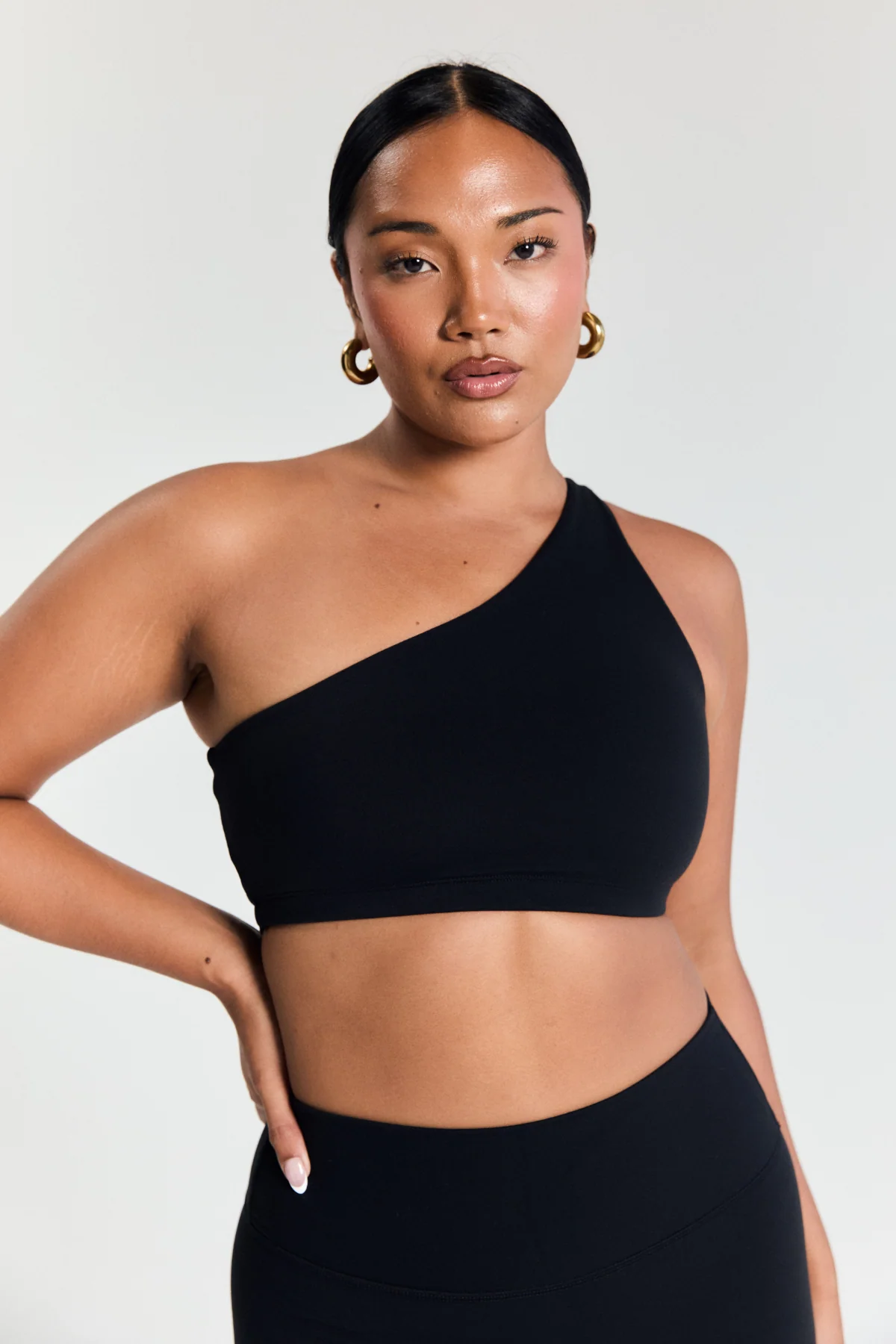 One of our newer styles of crop - a unique asymmetrical crop in black. Made from our buttery soft activewear fabric, designed for movement.